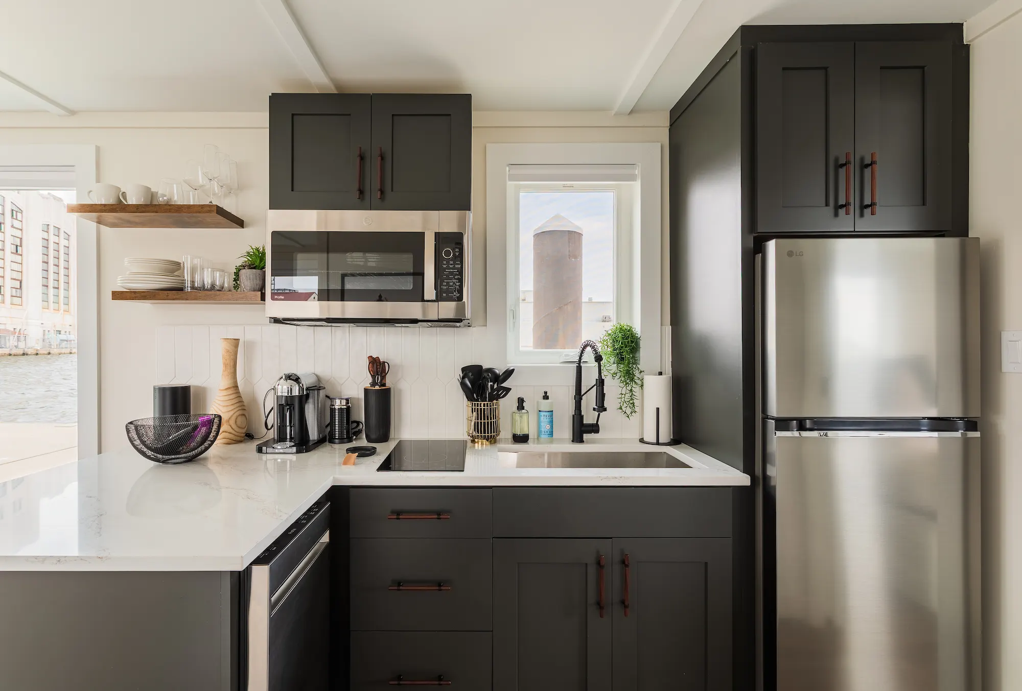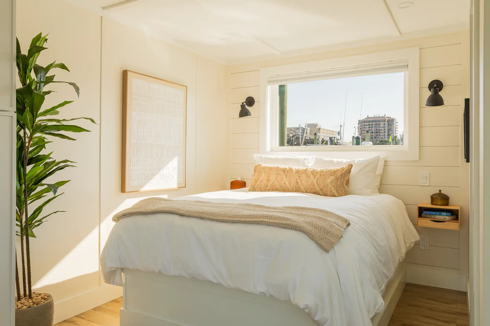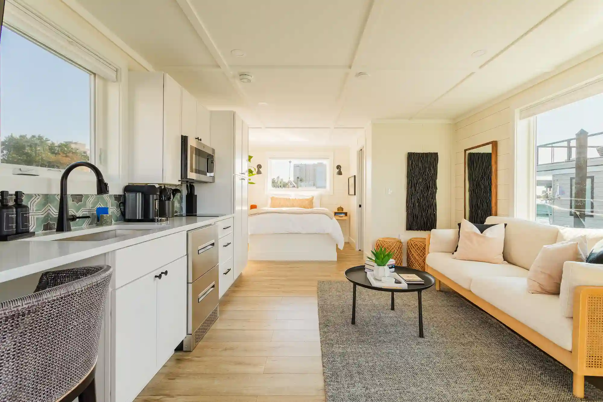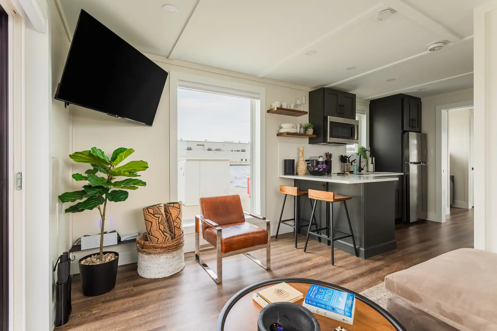 The HARBOR 1-Bedroom is a 532 sq. ft. floating retreat designed for two guests, offering a spacious queen bedroom, a full bathroom, and an open-concept living space. Thoughtfully designed for comfort and style, this model features a fully equipped kitchen with a bar, perfect for casual dining or entertaining. The expansive rooftop deck provides a front-row seat to stunning waterfront views, creating an inviting space to unwind. Blending modern design with efficient use of space, the HARBOR 1-Bedroom is ideal for those looking to step into on-water ownership with a model that balances investment potential and personal enjoyment.